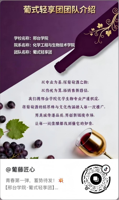 “青春第一弹 蓄势待发!”邢台学院化学工程与生物技术学院的葡式轻享团在抖音分享了参赛的心情,打出了“以专业为基 探葡萄酒之韵;以热忱为翼,拓销售新路径”的口号,将携专业优势和积淀,将葡萄酒的醇厚味道与文化内涵融入每一次推广,用真诚传递品质,用创新链接市场。